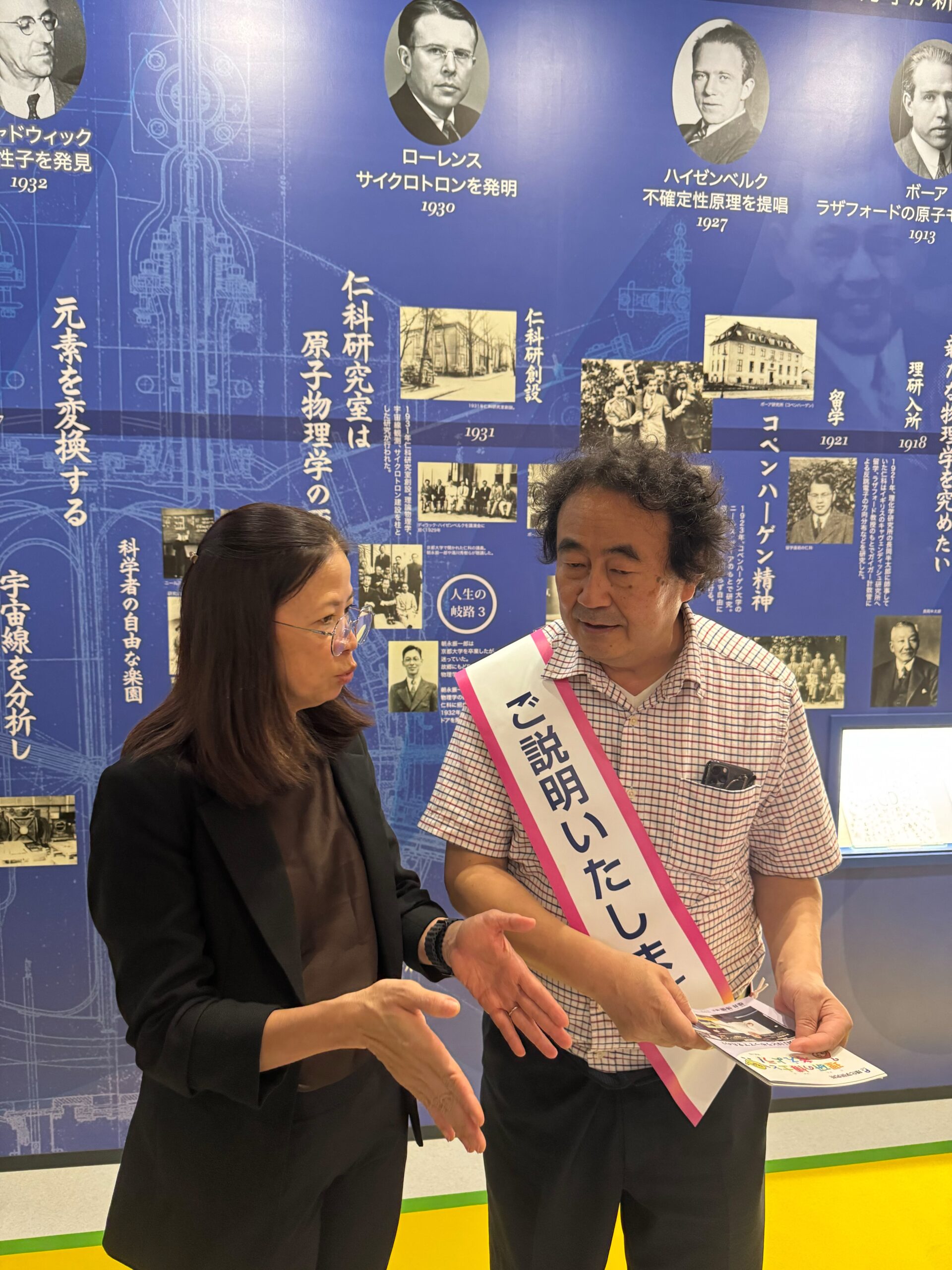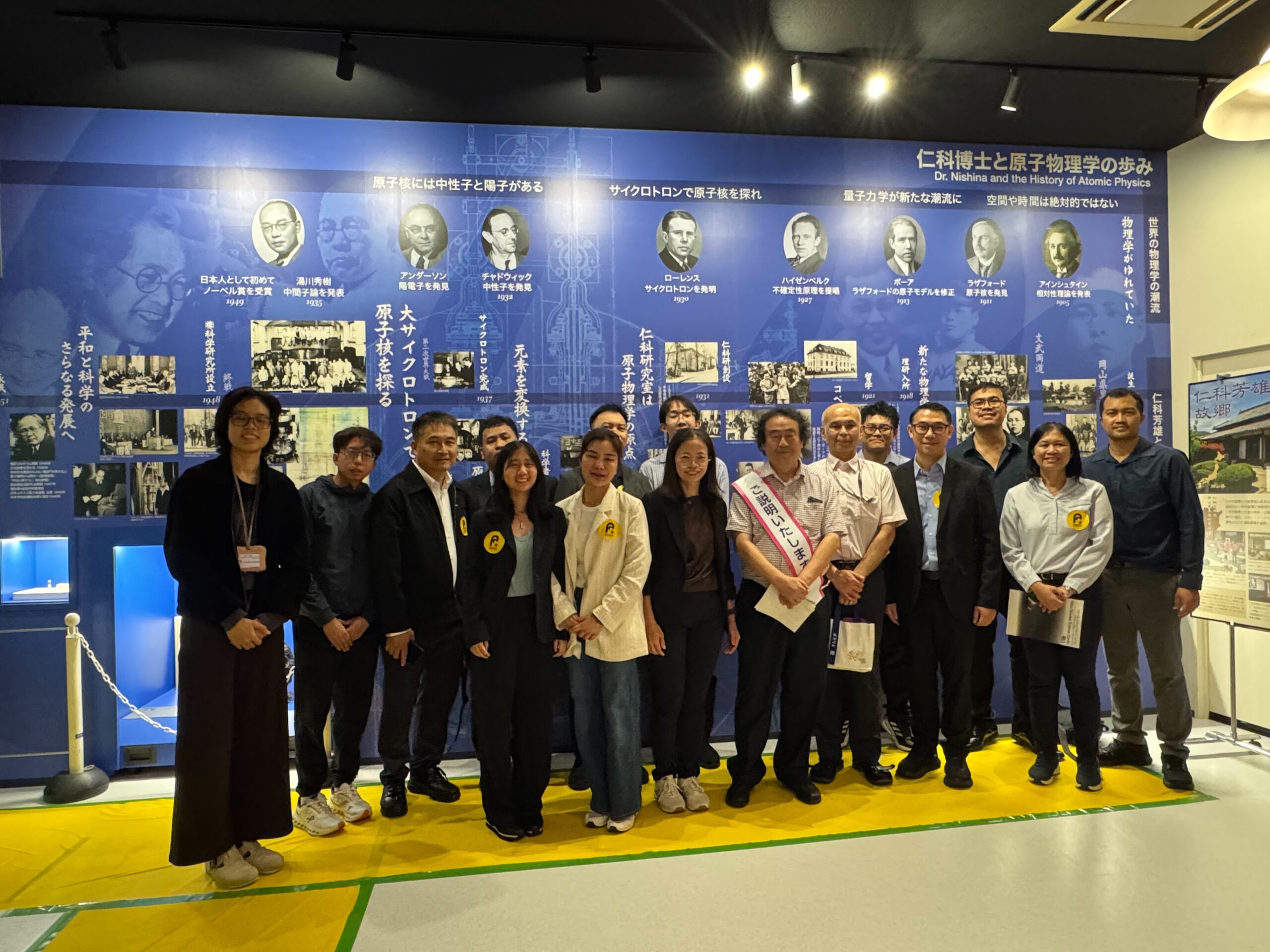คณะฯ ได้เดินทางไปยัง ศูนย์นิชินะฯ ซึ่งเป็นหน่วยงานภายใต้สถาบัน RIKEN (ญี่ปุ่น) ศูนย์กลางการวิจัยระดับโลกที่ใช้เครื่องเร่งอนุภาคเพื่อศึกษาวิจัยพื้นฐานของสสาร การกำเนิดของธาตุ และความเป็นไปได้ในการแปรรูปธาตุ (Element Transmutation) การเยี่ยมชมครั้งนี้ได้รับเกียรติจาก Dr. Isao Watanabe นักวิทยาศาสตร์วิจัยอาวุโส สถาบันวิจัย RIKEN นำชมการดำเนินงานของโรงงานผลิตลำไอโซโทปรังสี (RI Beam Factory หรือ RIBF) ซึ่งเป็นเครื่องเร่งอนุภาคเพื่อการวิจัยทางนิวเคลียร์ โดยผสมผสานเทคโนโลยีเครื่องเร่งไอออนหนักที่มีอยู่เดิมกับชุดเครื่องเร่งพลังงานสูงรุ่นใหม่ล่าสุด เป้าหมายคือการผลิต “ลำแสงไอออนหนัก” ที่มีความเข้มสูงที่สุดในโลก และ “ลำแสงไอโซโทปรังสี (RI beams)” ที่มีพลังงานสูง ด้วยการใช้ชุดเครื่องเร่งใหม่ (SRC) ร่วมกับเครื่องคัดแยก BigRIPS ทำให้ RIBF สามารถสร้างลำแสงพลังงานสูงเพื่อขยายขอบเขตการวิจัยนิวเคลียร์และค้นพบไอโซโทปใหม่ ๆ ในแผนภูมินิวเคลียร์