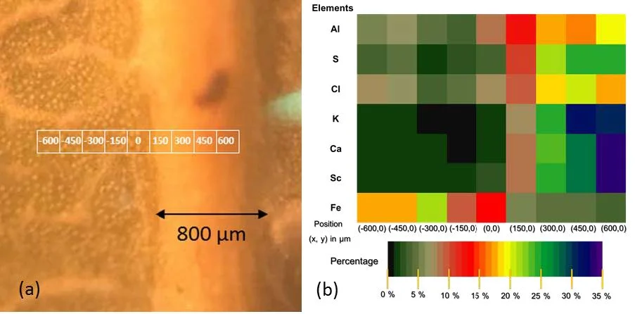 ตัวอย่างการวิเคราะห์ความเข้มข้นของสารอาหารในใบพืช จะสังเกตได้ว่าบริเวณเส้นกลางใบจะมีความเข้มข้นของธาตุต่าง ๆ มากกว่าบริเวณใบ ยกเว้นธาตุเหล็ก