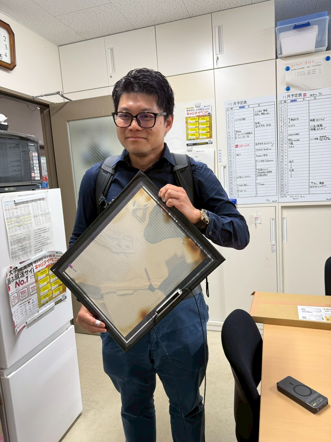 ในวันที่ 15 ตุลาคม 2568 ทางคณะฯ ได้เยี่ยมชมห้องวิจัย Wakamiya Lab ณ Institute for Chemical Research วิทยาเขต Uji แห่งมหาวิทยาลัยเกียวโต ซึ่งมุ่งเน้นการวิจัยด้านอิเล็กทรอนิกส์อินทรีย์ ตั้งแต่การออกแบบและสังเคราะห์โมเลกุล การศึกษาสมบัติไปจนถึงการสร้างอุปกรณ์และโมดูล โดยเน้นการทำความเข้าใจการจัดเรียงตัวของโมเลกุลในสถานะของแข็งและผลต่อสมบัติการนำไฟฟ้าและประสิทธิภาพของอุปกรณ์เซลล์แสงอาทิตย์ชนิดเพอรอฟสไกต์ โดย Prof. Atsushi Wakamiya, Deputy Executive Vice-President for Planning, Coordination, and Research Promotion Deputy Provost และ Co-Founder Chief Advisor (Science & Technology) EneCoat Technologies, Co. Ltd. ให้การต้อนรับ พร้อมด้วยนักศึกษาไทยที่ทำวิจัยร่วมกับทางมหาลัย